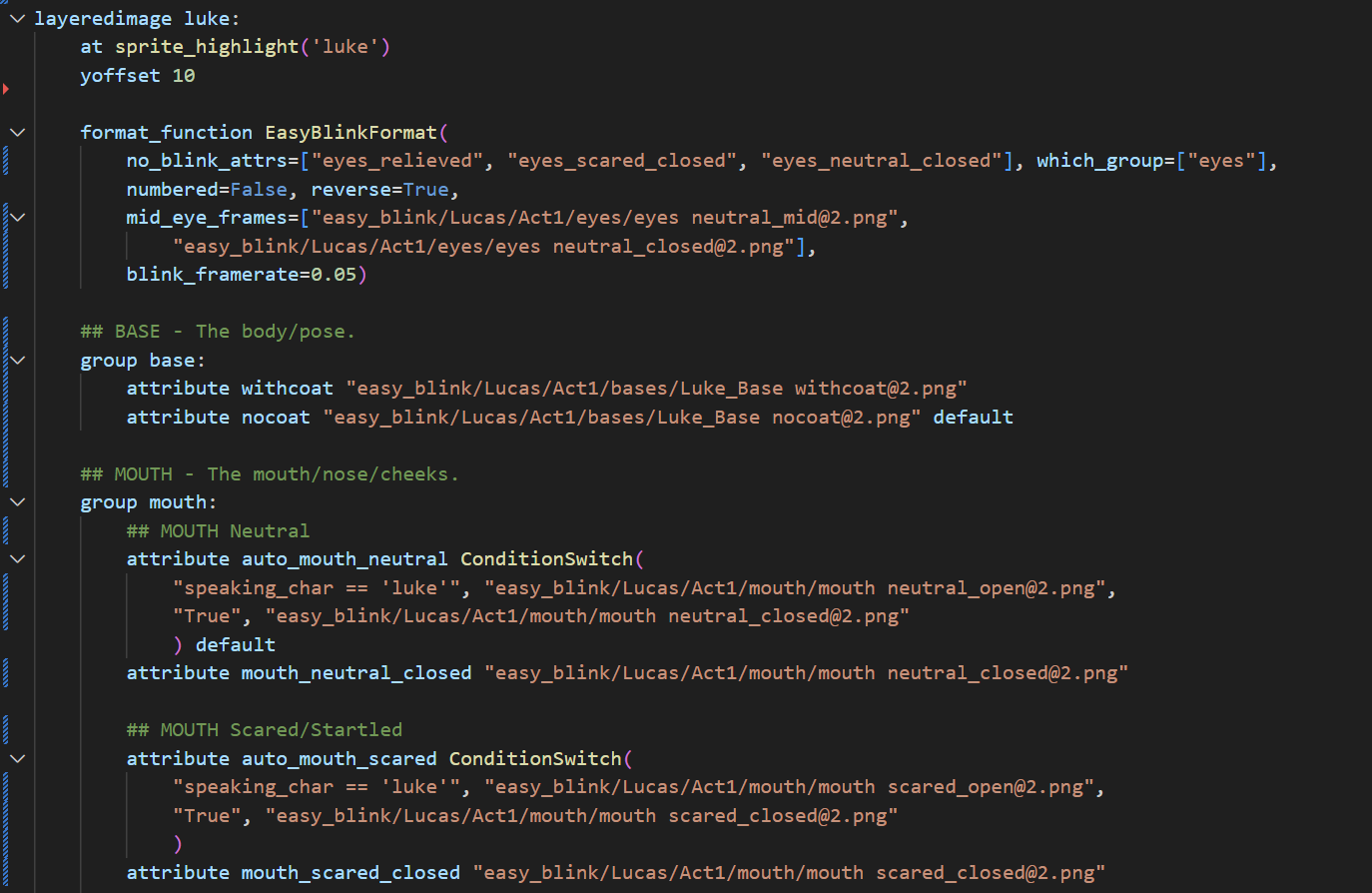 Like how I'm probably going to drive myself nuts with the character art. From the beginning, I knew I wanted the characters to blink and have different open/closed mouth states with varying expressions.